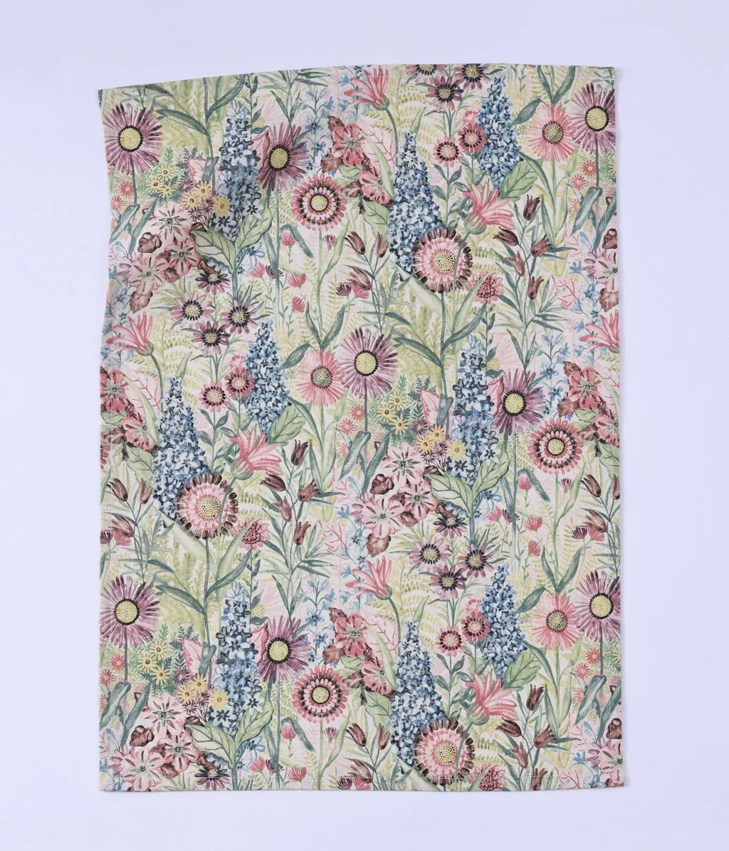 A beautiful floral design featuring gorgeous hues of green, pink and blue. Printed on a European flax line cotton blend.